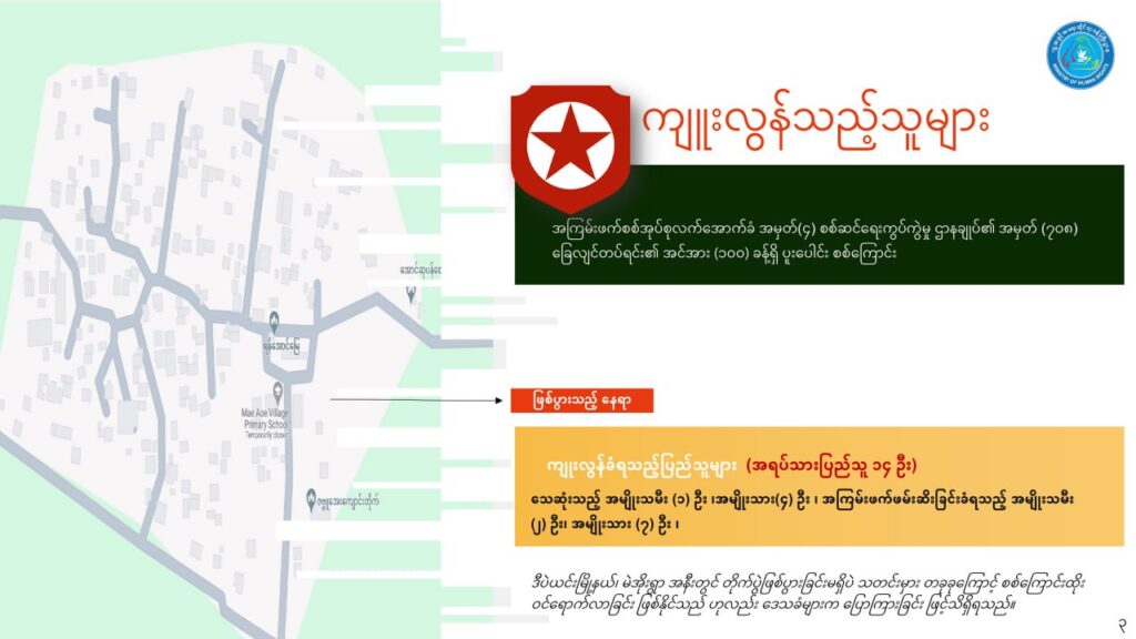 အဆိုပါဖြစ်စဉ်နှင့် ပတ်သတ်၍ NUG အစိုးရ လူ့အခွင့်အရေးဆိုင်ရာဝန်ကြီးဌာနက အကြမ်းဖက်စစ်တပ်၏ ကျုးလွန်မှုများကို အပြစ်ပေးအရေးယူနိုင်ရေး အစွမ်းကုန်တာဝန်ယူဆောင်ရွက်သွားမည်ဟု သိရသည်။