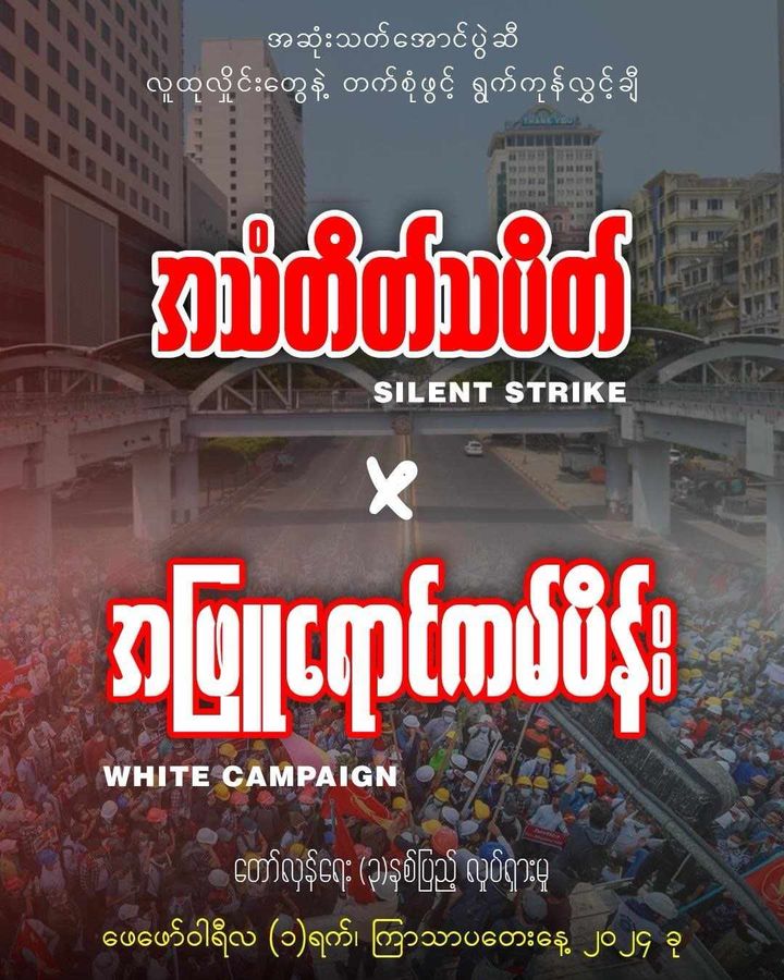 နွေဦးတော်လှန်ရေး ၃နှစ်ပြည့် အပြင်မထွက် အသံတိတ်သပိတ် (Silent Strike) နှင့် အဖြူရောင် လှုပ်ရှားမှု (White Campaign) တွင်ပြည်သူလူထုတစ်ရပ်လုံး လှည်းနေလှေအောင်းမြင်းစောင်းမကျန်ပါဝင်ကြရန် ဦးမင်းကိုနိုင်၊ ဒေါက်တာတေဇာဆန်းအပါအဝင် သပိတ်ခေါင်းဆော်များက တိုက်တွန်းထားသည်။
