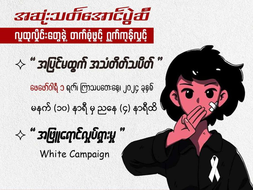 White Campaign ကိုတော့ တော်လှန်ရေး (၃) နှစ်ပြည့် တရက်တည်းအတွက်သာမကဘဲ ရှေ့ဆက်လည်း အပတ်စဉ် တနလ်ာနေ့တိုင်း ဖော်ဆောင်သွားကြဖို့ပါ။ အထူးသဖြင့် နိုင်ငံတကာရောက် ရဲဘော်တွေနဲ့ တော်လှန်ရေးအင်အားစုတွေကလည်း White Campaign ကို ပြည်ပမှာ အစွမ်းကုန် ဆင်နွှဲကြဖို့ အားခဲပြင်ဆင်နေကြပါတယ်။ ပြည်တွင်းပြည်ပ ဟန်ချက်ညီ ပူးပေါင်းဆောင်ရွက်ကြဖို့ပါပဲ။