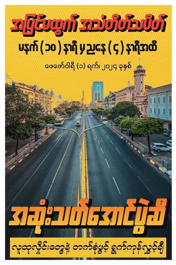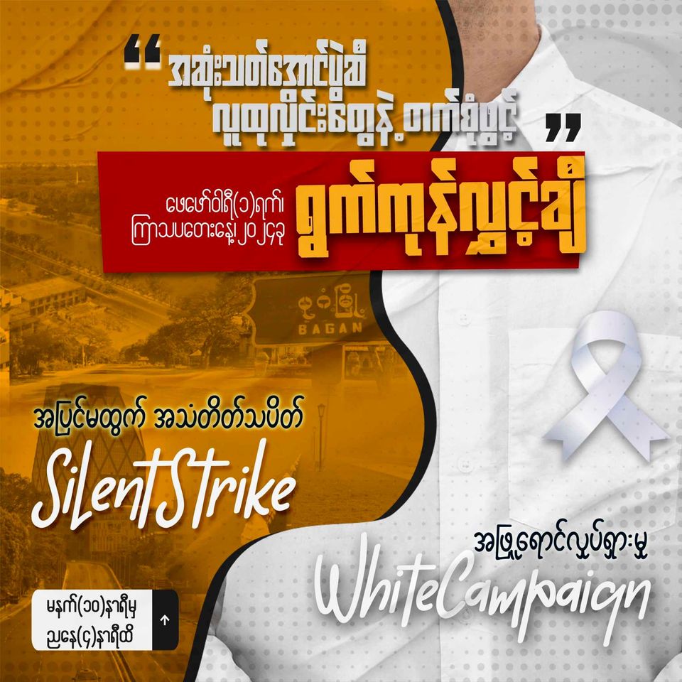 ဒီ Silent Strike ရဲ့ ဆိုလိုရင်းက အဲ့ဒီရက်၊ အဲ့ဒီအချိန်တွင်း လမ်းမတွေမှာ၊ အများပြည်သူဆိုင်ရာ နေရာတွေမှာ တိတ်ဆိတ် ခြောက်ကပ်နေဖို့ပဲ။ ပြည်သူတွေက အပြင်ကို မထွက်ကြဖို့ပဲ။ ကိုယ့်အိမ်၊ ကိုယ်ဈေးဆိုင်၊ ကိုယ့်ရုံး၊ ကိုယ့်အမိုးအကာအောက်မှာပဲ နေကြဖို့ပါပဲ။ Silent Strike ကို ပညာသားပါပါနဲ့ ဖော်ဆောင် ဆင်နွှဲကြမယ်နော်။