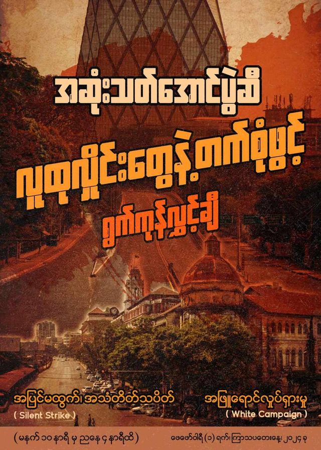 Silent Strike (အပြင်မထွက်၊ အသံတိတ်သပိတ်) ဟေ့ဆိုရင် ပြည်သူအားလုံး ရင်းနှီးကျွမ်းဝင်ကြပြီးသားပါပဲ။ နေရာဒေသမရွေး လူထုအားလုံး ပါဝင်နိုင်တဲ့ တိုက်ပွဲနည်းနာကြီးဖြစ်သလို စစ်အာဏာရူးတွေ ဒူးတုန်အောင်ကြောက်တဲ့ သပိတ်ကြီးပါ။ မြန်မာလူထုရဲ့ တော်လှန်စိတ်၊ ဇွဲသတ္တိနဲ့ စုစည်းညီညွတ်မှုကို တကမ္ဘာလုံးက အသိအမှတ်ပြု၊ အံ့ဩကြရတဲ့ တိုက်ပွဲနည်းနာကြီးလည်း ဖြစ်ပါတယ်။ ဒီနည်းနာက အသံတိတ်ပေမယ့် အလံလိပ်တာ လုံးဝ မဟုတ်ပါဘူး။ ငါတို့ မြို့၊ ငါတို့ ဒေသ ငါတို့ ပိုင်တယ်။ ငါတို့ ငြိမ်ချင် ငြိမ်မယ်၊ ငါတို့ လှုပ်ချင် လှုပ်မယ်ဆိုတာ ပြည်သူ့သတင်းစကားပဲ။ စစ်အာဏာရူးတွေ ငါတို့ကို “လုံးဝ အုပ်ချုပ်ခွင့်မရစေရ” ဆိုတာ ကျွန်ုပ်တို့လူထုကြီးရဲ့ ကြွေးကြော်သံ။