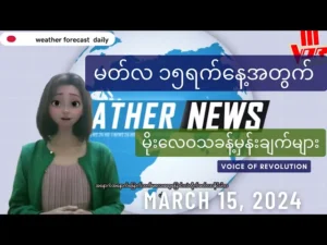 မတ်လ ၁၅ရက်နေ့ မနက်ဖြန်အတွက် မိုးလေဝသ ခန့်မှန်းချက်များကို အောက်ပါ လင့်ခ်ကတဆင့် ဝင်ရောက်ကြည့်ရှုနိုင်ပါသည်။ https://www.youtube.com/watch?v=Tw5kWK4AW94&t=2s