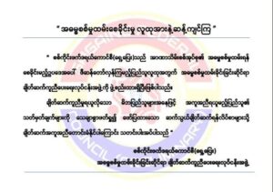 မတ် ၁၉၊ VOR ဧရာ၀တီတိုင်း လပွတ္တာမြို့နယ်၊ ကျူတောကျေးရွာအုပ်စု၊ ချောင်းကွဲကြီးကျေးရွာတွင် ကျေးရွာအုပ်ချုပ်ရေးမှူးက အတွင်းတွင် စစ်တပ်က လူငယ်များ စစ်မှုထမ်းကြရန် ရပ်ကွက်/ကျေးရွာအုပ်ချုပ်ရေးမှူးများမှတစ်ဆင့် ဟောပြော စည်းရုံးခိုင်းပြီး စစ်မှုထမ်းရန် မဲပေါက်သည့် လူငယ်များ၏ မိသားစုကို လူငယ်တစ်ဦးအတွက်...
