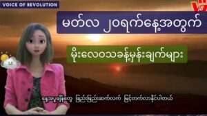 နေ့အပူချိန်တွေ တဖြည်းဖြည်း ဆက်လက် မြင့်တက်လာနိုင်ပါတယ်။ မတ်လ ၂၀ရက် မနက်ဖြန်အတွက် မိုးလေဝသခန့်မှန်းချက်များကို အောက်ဖော်ပြပါ လင့်ခ်မှတဆင့် ဝင်ရောက်ကြည့်ရှုနိုင်ပါသည်။ https://www.youtube.com/watch?v=1C1oZqbTG5s