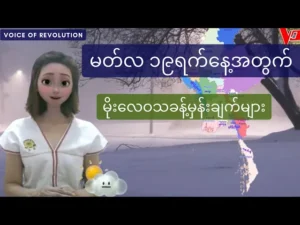 မတ်လ ၁၉ရက် မနက်ဖြန်အတွက် မိုးလေဝသခန့်မှန်းချက်များကိုအောက်ဖော်ပြပါလင့်ခ်မှတဆင့် ကြည့်ုနိုင်ပါသည်။ https://www.youtube.com/watch?v=zS4J1CJ4XyI